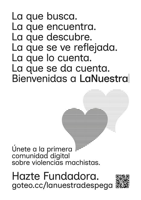 LaNuestra | Una comunidad digital que recogerá el primer archivo testimonial vivo del mundo sobre violencias machistas. Relatos de mujeres anónimas. Un espacio de conversación, escucha y sanación donde las mujeres podrán relacionarse con otras. Un proyecto transnacional, una red de redes que se expandirá y unirá a otras áreas geográficas para generar un universo nodular. Una comunidad que, como su símbolo, estará llena de 𝗔𝗠𝗢𝗥. Porque solo el amor es más fuerte que el odio.